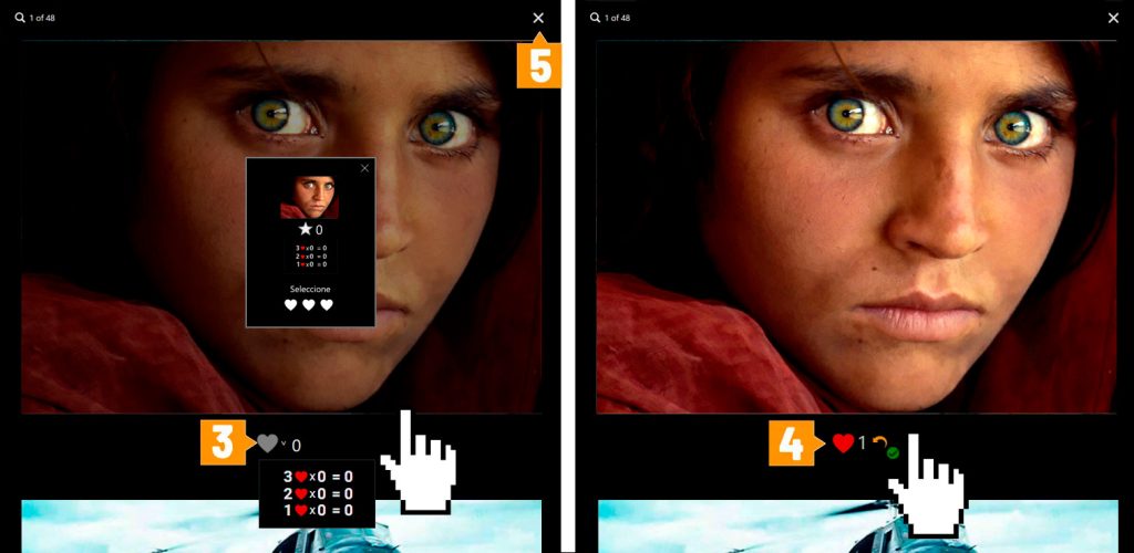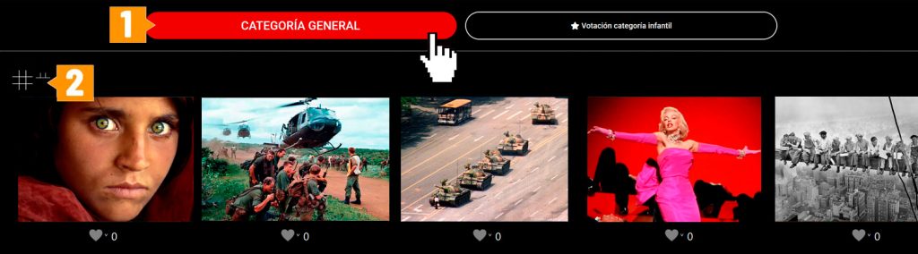 El voto puede emitirse pulsando sobre cualquiera de las fotos. Se abrirá la vista de blog (en formato grande y ordenadas en una columna). Al votar se iluminará un corazón (categoría infantil) y junto a su derecha se mostrará una flecha que permite deshacer ese voto si el mienbro del jurado desea adjudicárselo a otra obra. En la categoría general se mostrarán tres corazones entre los cuales cada miembro del jurado podrá seleccionar 3, 2 ó 1 (ganador, segundo y tercer clasificado) hasta un máximo de 6 puntos.